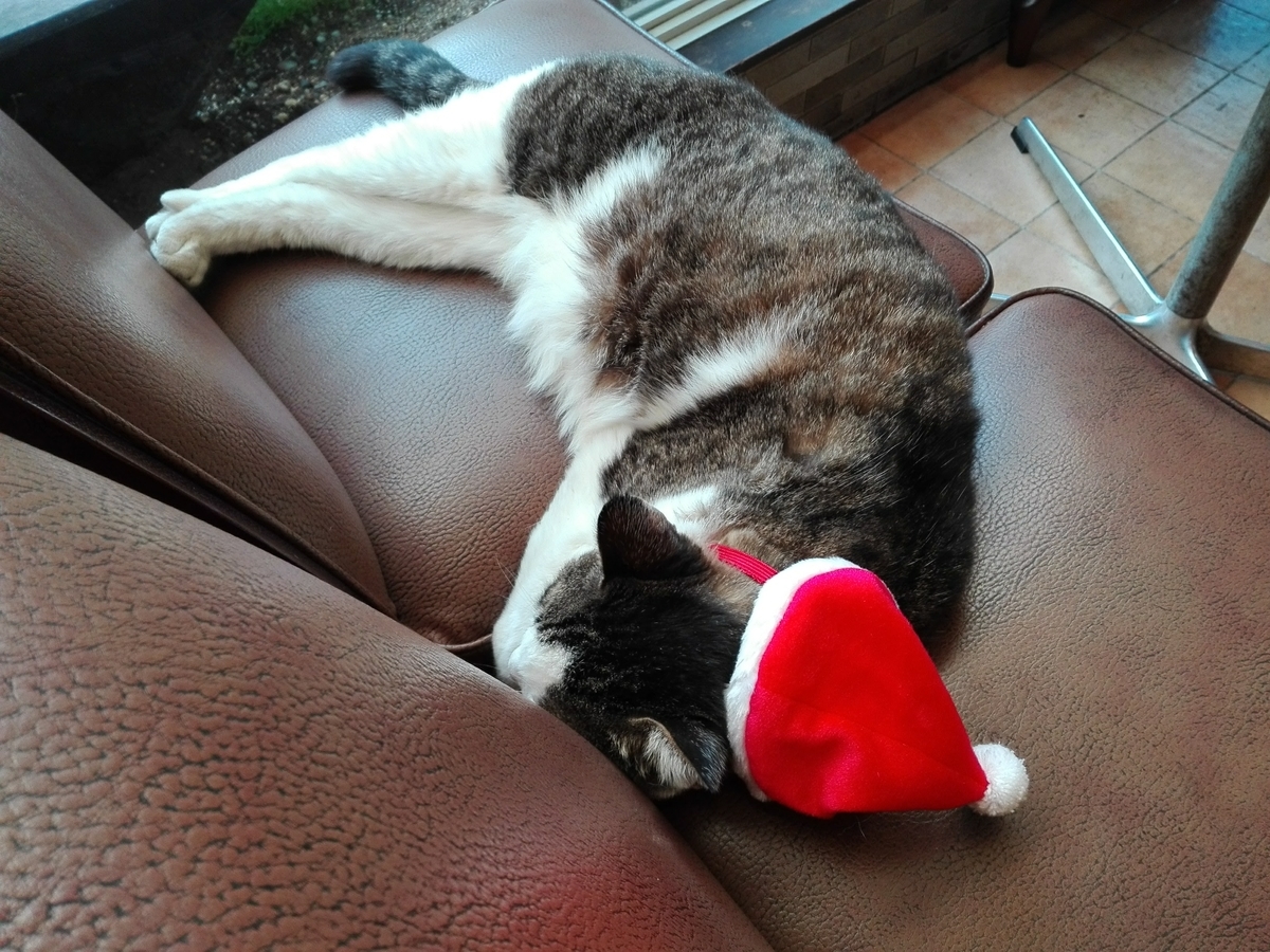 お客さんに触られても全く動じず。サンタ帽子もかぶせられるがままだそうです。